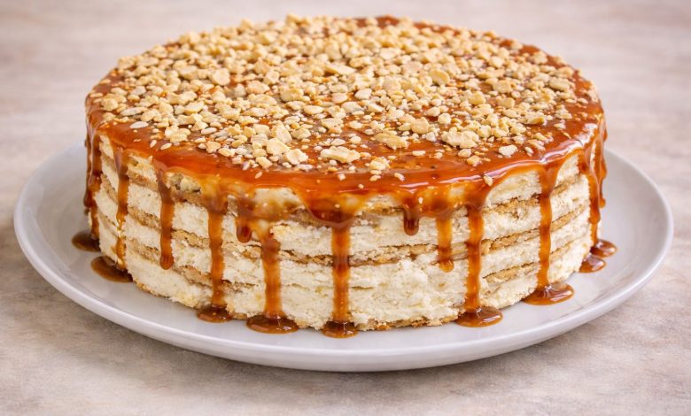 Depois de o bolo estar bem firme, desenforme e espalhe o caramelo salgado por cima. Finalize com bolacha Maria triturada para dar um toque crocante antes de servir.