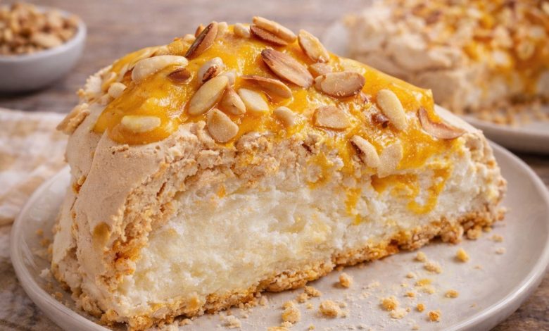 9 claras de ovo, 400 g de açúcar, 1 c. sopa de amido de milho, 1 c. chá de vinagre, 1 pitada de sal, doce de ovos q.b., amêndoa laminada q.b., pinhões q.b.