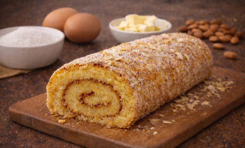 Preparação: Comece por raspar a laranja e espremer o sumo, reservando ambos. De seguida, triture a amêndoa e derreta a manteiga, reservando igualmente. Entretanto, forre o fundo de um tabuleiro (25×30 cm) com papel vegetal, unte-o com manteiga e reserve. Numa taça, coloque os ovos, o açúcar, a raspa e o sumo da laranja e bata tudo com a vara de arames durante cerca de cinco minutos, até obter um creme homogéneo. Logo depois, junte a amêndoa moída e, em seguida, a manteiga derretida, envolvendo bem. Verta a massa para o tabuleiro e leve ao forno pré-aquecido a 180 ºC durante cerca de 15 minutos. Entretanto, estenda uma folha de papel vegetal e salpique-a com açúcar. Assim que retirar o bolo do forno, vire-o imediatamente sobre o papel preparado e enrole com cuidado. Deixe o rolo embrulhado no papel durante cerca de uma hora. Passado esse tempo, retire o papel vegetal e transfira o rolo para um prato de servir.